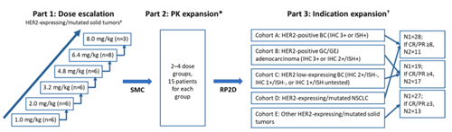 HORIZON-X研究是一项国际多中心、首次在人体中进行的I期试验,在33个中心开展。纳入了HER2表达或突变的不可切除、晚期或转移性实体瘤,并且对标准治疗无效或不耐受的患者。瑞康曲妥珠单抗通过静脉注射给药,每3周1次,每公斤体重剂量从1.0-8.0mg/kg进行剂量爬坡,选择4.8-8.0mg/kg进行PK拓展,选择4.8和6.4mg/kg进行疗效拓展。主要研究终点为剂量限制性毒性、安全性和Ⅱ期推荐剂量。