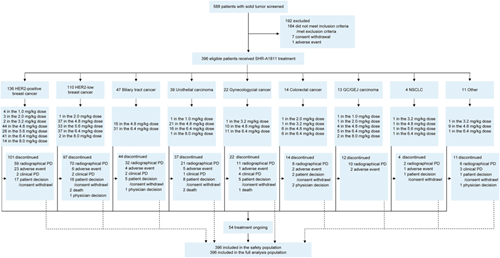 2020年9月7日至2024年6月4日,396例患者接受了瑞康曲妥珠单抗治疗,患者既往中位治疗方案数为3(IQR:2-5)。在246例乳腺癌患者中,HER2阳性乳腺癌患者(N=136)的既往中位治疗方案数为3(IQR:2-5),HER2低表达乳腺癌患者(N=110)为3(IQR:2-5)。HER2阳性乳腺癌队列中,99.3%、43.4%和14.7%的患者分别接受过曲妥珠单抗、帕妥珠单抗和恩美曲妥珠单抗(T-DM1)治疗;HER2低表达乳腺癌队列中,上述比例分别为13.6%、5.5%和2.7%。