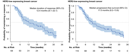 在伴有肝转移/脑转移(疾病进展高风险人群)的乳腺癌患者中,肿瘤应答同样具有持久性。HER2阳性乳腺癌肝转移患者(N=52)的mPFS为27.8个月(95% CI:11.0-38.7),mDoR为30.4个月(95% CI:11.5-NE);HER2低表达患者(N=65)的mPFS为10.9个月(95% CI:7.8-13.6);mDoR为10.8个月(95% CI:8.1-22.1)。HER2阳性乳腺癌脑转移患者(N=18)中位PFS为14.1个月(5.3–19.5),HER2低表达患者(N=3)为8.5个月(7.0–NE)。